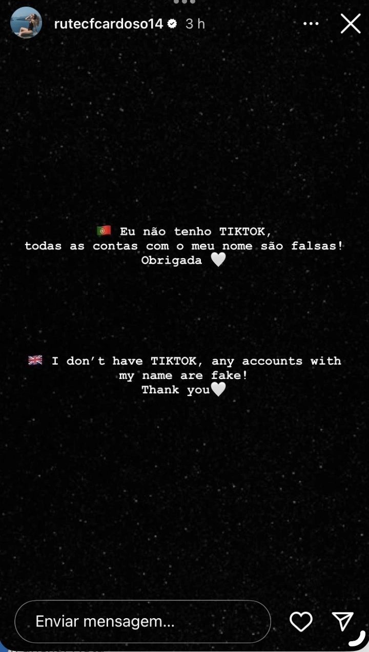 Rute Cardoso recorreu ao Instagram para esclarecer que não tem conta na rede social TikTok. Desde o acidente que vitimou o internacional português e o irmão, foram criadas dezenas de páginas falsas com o nome e fotografias da viúva.