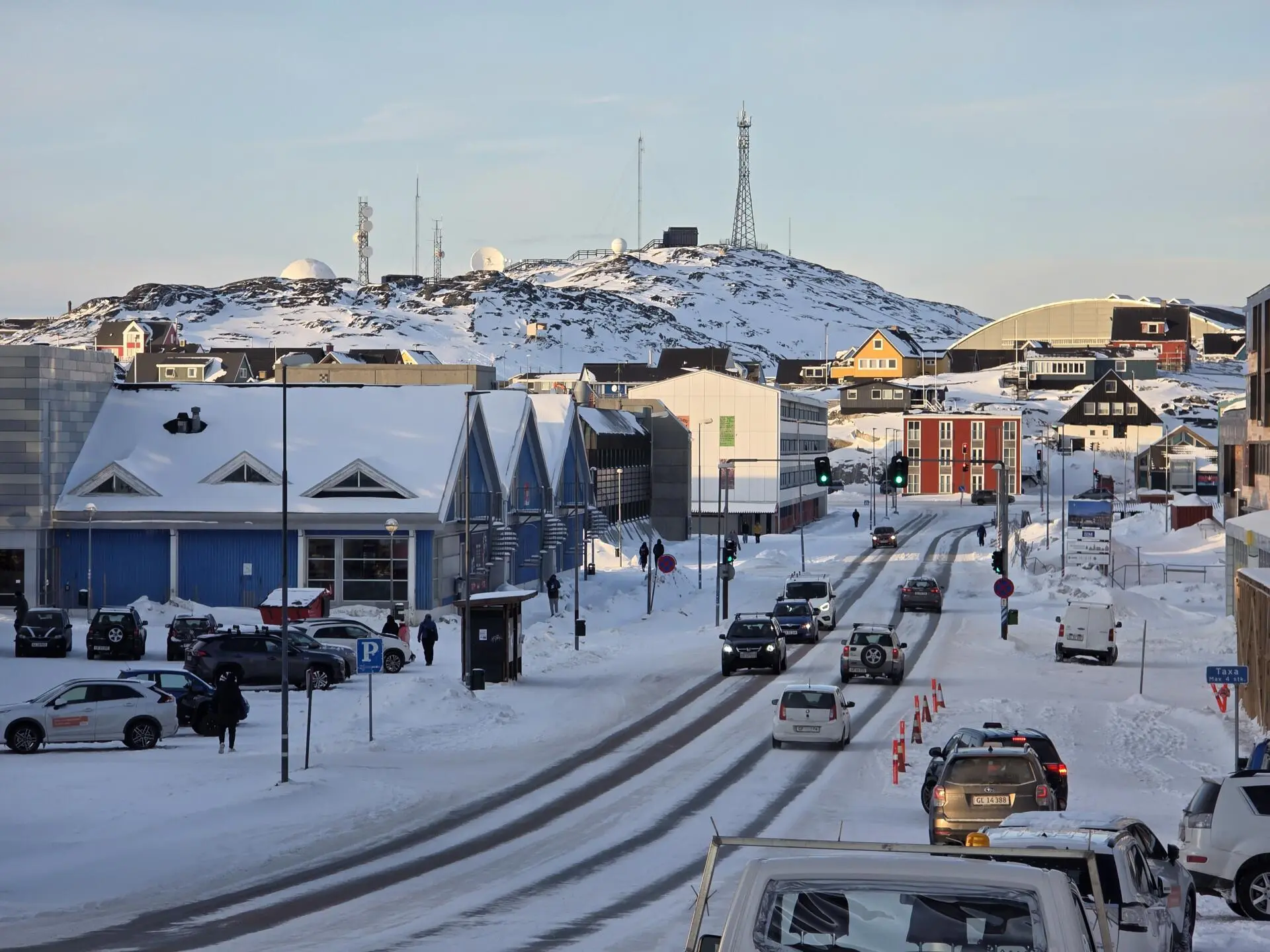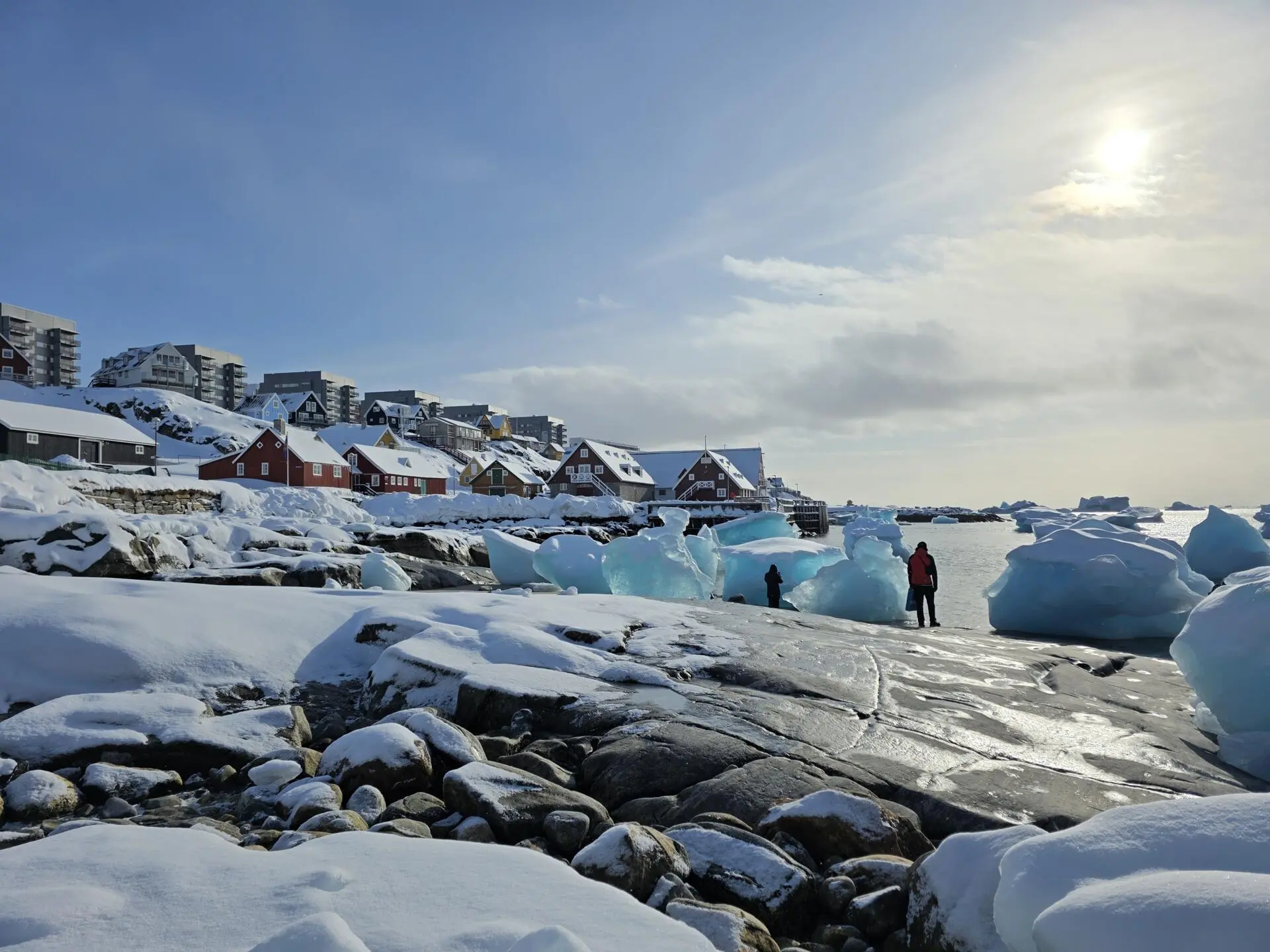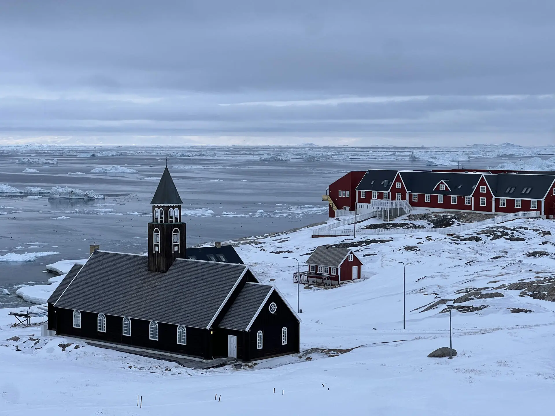 No horizonte, prédios tranquilos, o shopping que se destaca na paisagem e a catedral que é uma pequena igreja vermelha não muito longe da estátua de Hans Egede, o missionário que evangelizou a ilha no princípio do século XVIII e é conhecido como "o apóstolo da Gronelândia" por ter revitalizado o interesso do reino pelo distante território ártico. É dele a fundação de Nuuk, outrora Godthab.
