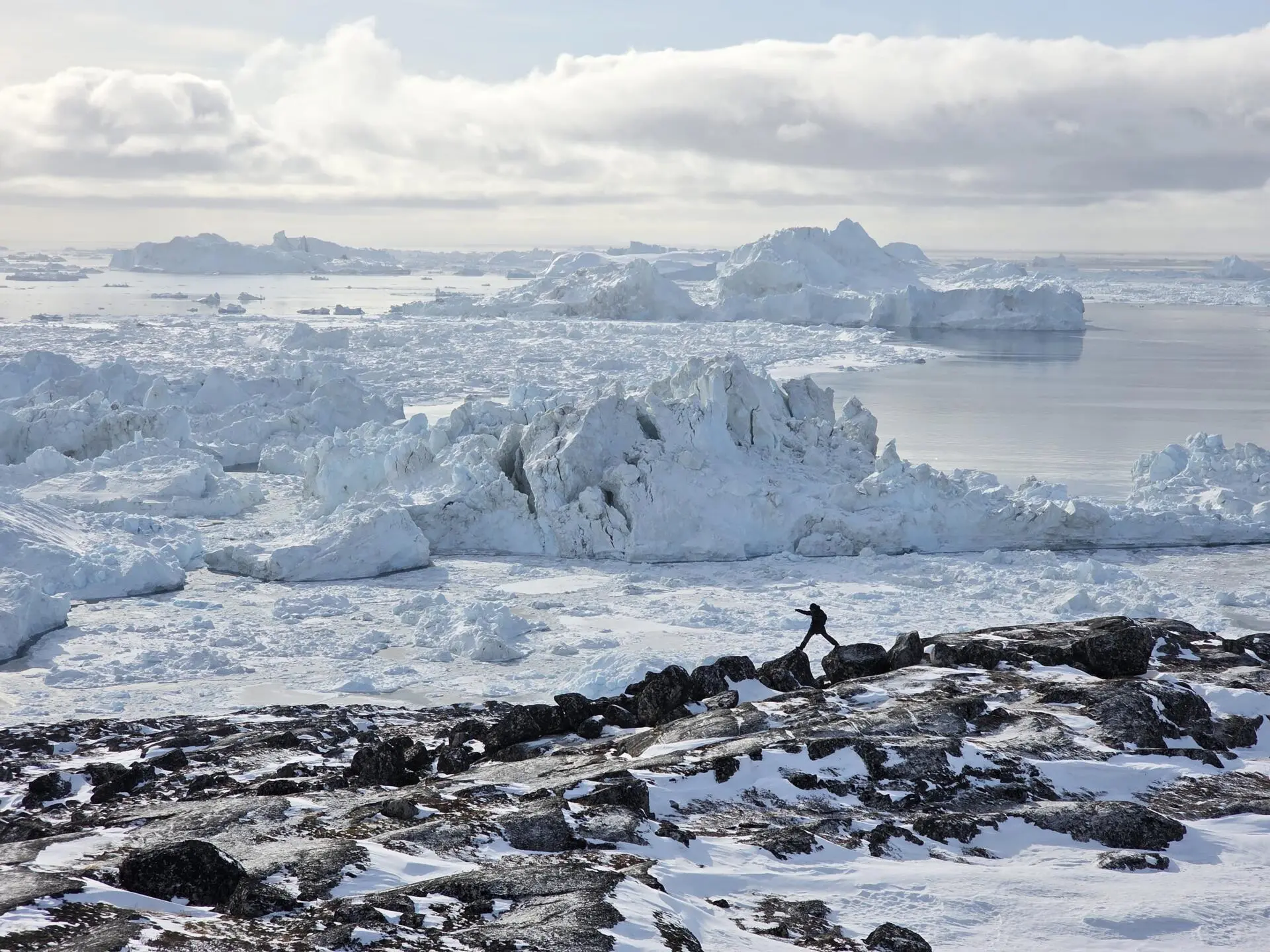 O absoluto silêncio da paisagem não condiz com toda essa enormidade. O glaciar, de aparência estática quando o apercebemos do pequeno Dash-8 que nos pousou em Ilulissat, outrora referida como Jakobshavn, estica-se por mais de 50 km, com sete quilómetros de largura e mil metros de espessura, avança 40 metros por dia e cospe anualmente 40 a 50 km cúbicos de gelo no fiorde. Nos últimos anos, duplicou a sua velocidade e recuou, primeiro num momento de choque, 12 km num ano, 2002, depois mais 10 km até hoje. Há fontes que lhe atribuem 3% da subida do nível do mar.