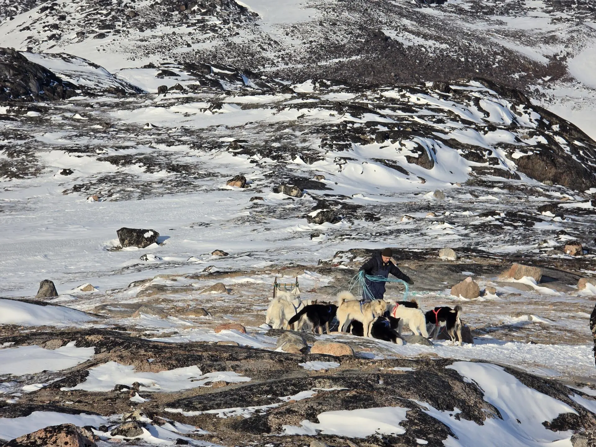 Atrelados os cães, Norsaq coloca os pertences de todos na algibeira junto às pegas, convida-nos a sentar sobre peles de rena e mostra-nos como nos devemos segurar. Mal tenho tempo de experimentar e já vamos ensandecidos colinas abaixo, atravessamos a povoação por esta autoestrada de trenós e seguimos a toda a velocidade em direção à montanha, que subimos mais tranquilamente, havendo até um momento em que apeamos e empurramos o trenó para aliviar os cães.